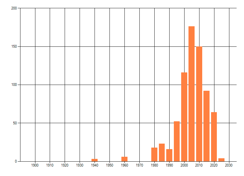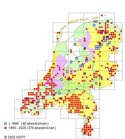 Het aantal atlasblokken (5x5 km) waarin de soort is gemeld binnen een periode van vijf jaar (vanaf 1980) of twintig jaar. Niet gecorrigeerd voor waarnemersinspanning en het aantal doorgegeven waarnemingen kan sterk variëren per periode, dus een trend in verspreiding kan hier niet direct uit worden afgelezen. Het opgegeven jaartal is het eerste jaar van de periode. Bron: gevalideerde waarnemingen uit de NDFF.