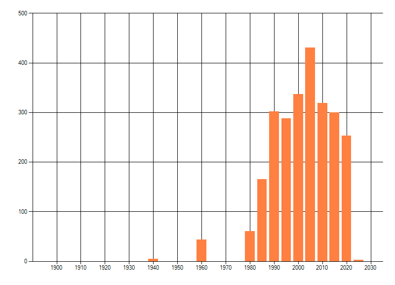 Het aantal atlasblokken (5x5 km) waarin de soort is gemeld binnen een periode van vijf jaar (vanaf 1980) of twintig jaar. Niet gecorrigeerd voor waarnemersinspanning en het aantal doorgegeven waarnemingen kan sterk variëren per periode, dus een trend in verspreiding kan hier niet direct uit worden afgelezen. Het opgegeven jaartal is het eerste jaar van de periode. Bron: gevalideerde waarnemingen uit de NDFF.