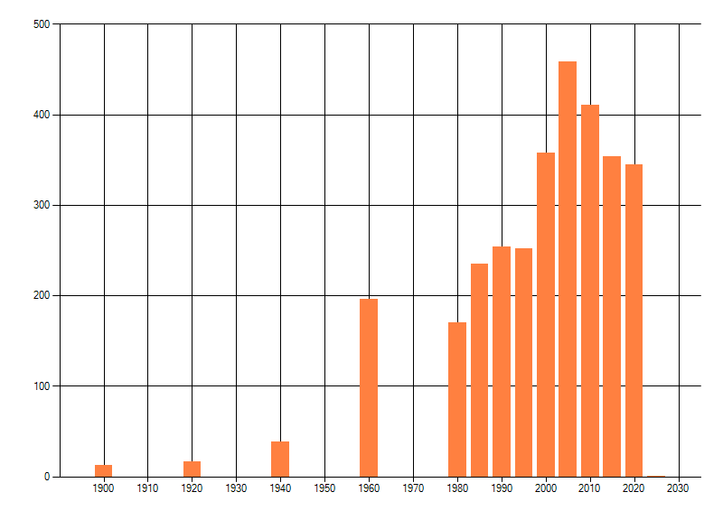 Het aantal atlasblokken (5x5 km) waarin de soort is gemeld binnen een periode van vijf jaar (vanaf 1980) of twintig jaar. Niet gecorrigeerd voor waarnemersinspanning en het aantal doorgegeven waarnemingen kan sterk variëren per periode, dus een trend in verspreiding kan hier niet direct uit worden afgelezen. Het opgegeven jaartal is het eerste jaar van de periode. Bron: gevalideerde waarnemingen uit de NDFF.