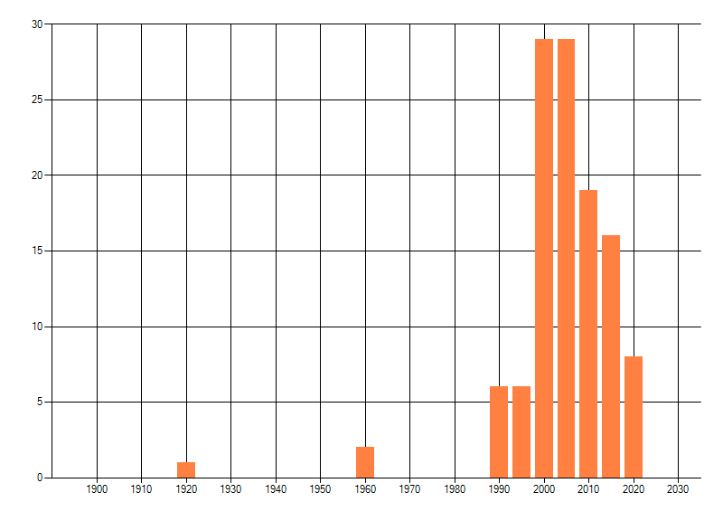 Het aantal atlasblokken (5x5 km) waarin de soort is gemeld binnen een periode van vijf jaar (vanaf 1980) of twintig jaar. Niet gecorrigeerd voor waarnemersinspanning en het aantal doorgegeven waarnemingen kan sterk variëren per periode, dus een trend in verspreiding kan hier niet direct uit worden afgelezen. Het opgegeven jaartal is het eerste jaar van de periode. Bron: gevalideerde waarnemingen uit de NDFF.
