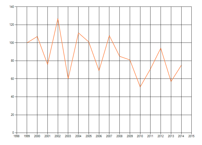Trend in het geschatte aantal individuen van paddenstoelen in bossen op de hoge zandgronden, weergegeven als indexcijfer (eerste jaar = 100). Bron:
