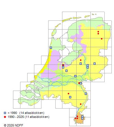 Vroeger zeld., voornamelijk in G; zeer zeld. in S, K, Z en R. Sinds 1986 nog slechts drie meldingen uit twee uurhokken. Oorzaak van achteruitgang onbekend, wellicht vermesting.
