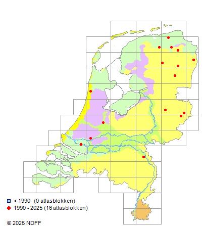 Het aantal atlasblokken (5x5 km) waarin de soort is gemeld binnen een periode van vijf jaar (vanaf 1980) of twintig jaar. Niet gecorrigeerd voor waarnemersinspanning en het aantal doorgegeven waarnemingen kan sterk variëren per periode, dus een trend in verspreiding kan hier niet direct uit worden afgelezen. Het opgegeven jaartal is het eerste jaar van de periode. Bron: gevalideerde waarnemingen uit de NDFF.