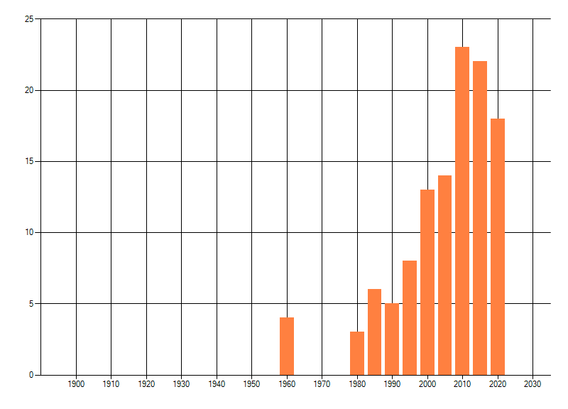 Het aantal atlasblokken (5x5 km) waarin de soort is gemeld binnen een periode van vijf jaar (vanaf 1980) of twintig jaar. Niet gecorrigeerd voor waarnemersinspanning en het aantal doorgegeven waarnemingen kan sterk variëren per periode, dus een trend in verspreiding kan hier niet direct uit worden afgelezen. Het opgegeven jaartal is het eerste jaar van de periode. Bron: gevalideerde waarnemingen uit de NDFF.