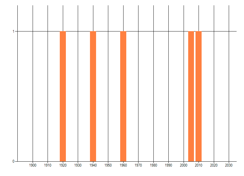 Het aantal atlasblokken (5x5 km) waarin de soort is gemeld binnen een periode van vijf jaar (vanaf 1980) of twintig jaar. Niet gecorrigeerd voor waarnemersinspanning en het aantal doorgegeven waarnemingen kan sterk variëren per periode, dus een trend in verspreiding kan hier niet direct uit worden afgelezen. Het opgegeven jaartal is het eerste jaar van de periode. Bron: gevalideerde waarnemingen uit de NDFF.