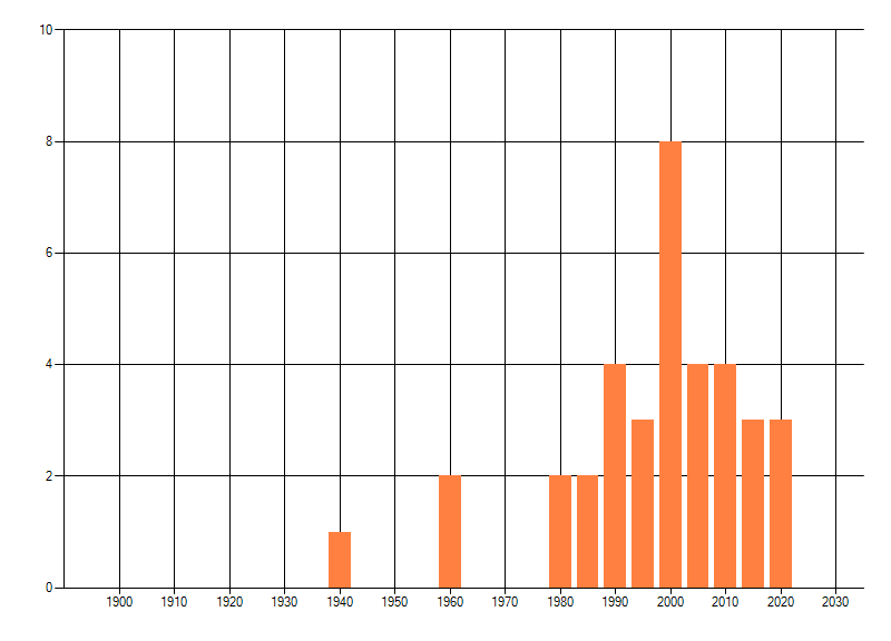 Het aantal atlasblokken (5x5 km) waarin de soort is gemeld binnen een periode van vijf jaar (vanaf 1980) of twintig jaar. Niet gecorrigeerd voor waarnemersinspanning en het aantal doorgegeven waarnemingen kan sterk variëren per periode, dus een trend in verspreiding kan hier niet direct uit worden afgelezen. Het opgegeven jaartal is het eerste jaar van de periode. Bron: gevalideerde waarnemingen uit de NDFF.