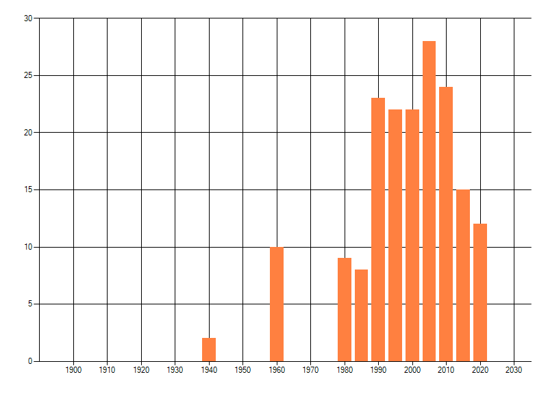 Het aantal atlasblokken (5x5 km) waarin de soort is gemeld binnen een periode van vijf jaar (vanaf 1980) of twintig jaar. Niet gecorrigeerd voor waarnemersinspanning en het aantal doorgegeven waarnemingen kan sterk variëren per periode, dus een trend in verspreiding kan hier niet direct uit worden afgelezen. Het opgegeven jaartal is het eerste jaar van de periode. Bron: gevalideerde waarnemingen uit de NDFF.
