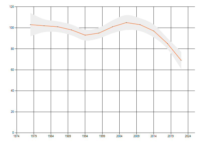 Gemiddelde trend van het aantal kilometerhokken waarin de soort voorkomt, weergegeven als indexcijfer (1975-1978 = 100). De trend is gecorrigeerd voor waarnemersinspanning en geeft de relatieve verandering in het aantal bezette kilometerhokken weer. Voor de berekening worden de data per periode van vier jaar samengenomen. In de grafiek correspondeert ieder punt met het laatste jaar van zo'n periode.