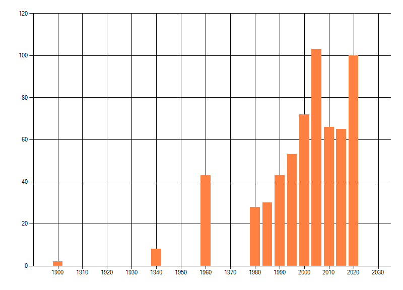 Het aantal atlasblokken (5x5 km) waarin de soort is gemeld binnen een periode van vijf jaar (vanaf 1980) of twintig jaar. Niet gecorrigeerd voor waarnemersinspanning en het aantal doorgegeven waarnemingen kan sterk variëren per periode, dus een trend in verspreiding kan hier niet direct uit worden afgelezen. Het opgegeven jaartal is het eerste jaar van de periode. Bron: gevalideerde waarnemingen uit de NDFF.