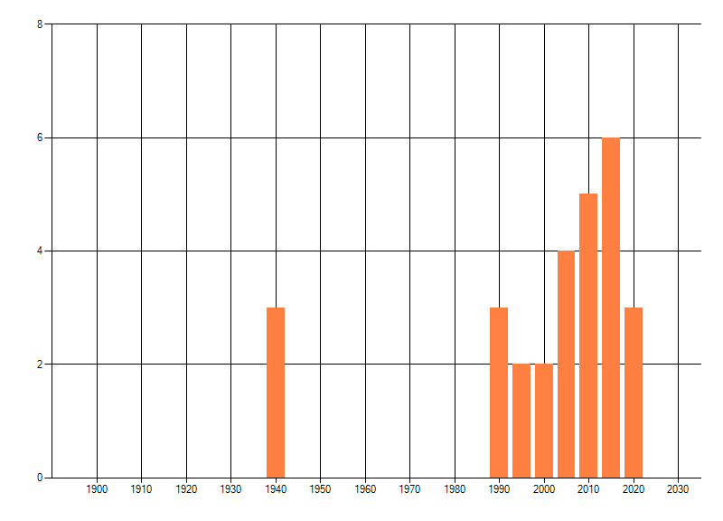 Het aantal atlasblokken (5x5 km) waarin de soort is gemeld binnen een periode van vijf jaar (vanaf 1980) of twintig jaar. Niet gecorrigeerd voor waarnemersinspanning en het aantal doorgegeven waarnemingen kan sterk variëren per periode, dus een trend in verspreiding kan hier niet direct uit worden afgelezen. Het opgegeven jaartal is het eerste jaar van de periode. Bron: gevalideerde waarnemingen uit de NDFF.