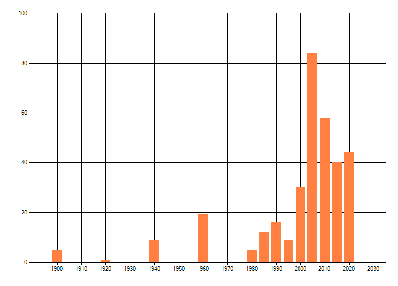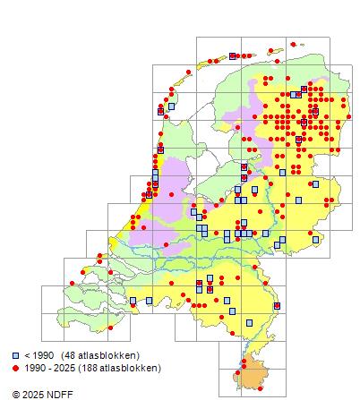 Het aantal atlasblokken (5x5 km) waarin de soort is gemeld binnen een periode van vijf jaar (vanaf 1980) of twintig jaar. Niet gecorrigeerd voor waarnemersinspanning en het aantal doorgegeven waarnemingen kan sterk variëren per periode, dus een trend in verspreiding kan hier niet direct uit worden afgelezen. Het opgegeven jaartal is het eerste jaar van de periode. Bron: gevalideerde waarnemingen uit de NDFF.