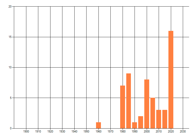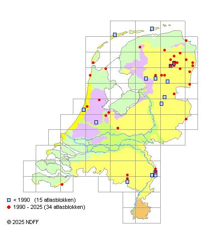 Het aantal atlasblokken (5x5 km) waarin de soort is gemeld binnen een periode van vijf jaar (vanaf 1980) of twintig jaar. Niet gecorrigeerd voor waarnemersinspanning en het aantal doorgegeven waarnemingen kan sterk variëren per periode, dus een trend in verspreiding kan hier niet direct uit worden afgelezen. Het opgegeven jaartal is het eerste jaar van de periode. Bron: gevalideerde waarnemingen uit de NDFF.