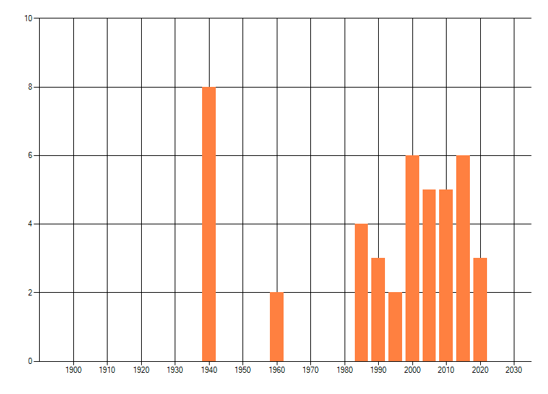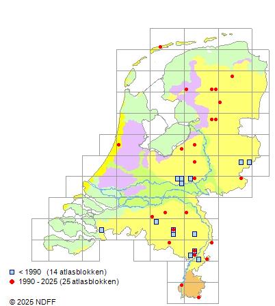 Het aantal atlasblokken (5x5 km) waarin de soort is gemeld binnen een periode van vijf jaar (vanaf 1980) of twintig jaar. Niet gecorrigeerd voor waarnemersinspanning en het aantal doorgegeven waarnemingen kan sterk variëren per periode, dus een trend in verspreiding kan hier niet direct uit worden afgelezen. Het opgegeven jaartal is het eerste jaar van de periode. Bron: gevalideerde waarnemingen uit de NDFF.