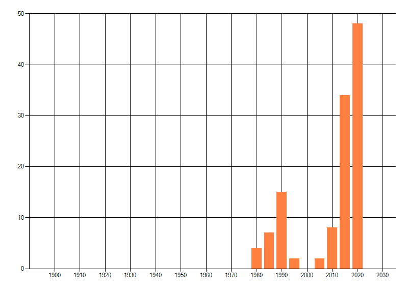 Het aantal atlasblokken (5x5 km) waarin de soort is gemeld binnen een periode van vijf jaar (vanaf 1980) of twintig jaar. Niet gecorrigeerd voor waarnemersinspanning en het aantal doorgegeven waarnemingen kan sterk variëren per periode, dus een trend in verspreiding kan hier niet direct uit worden afgelezen. Het opgegeven jaartal is het eerste jaar van de periode. Bron: gevalideerde waarnemingen uit de NDFF.
