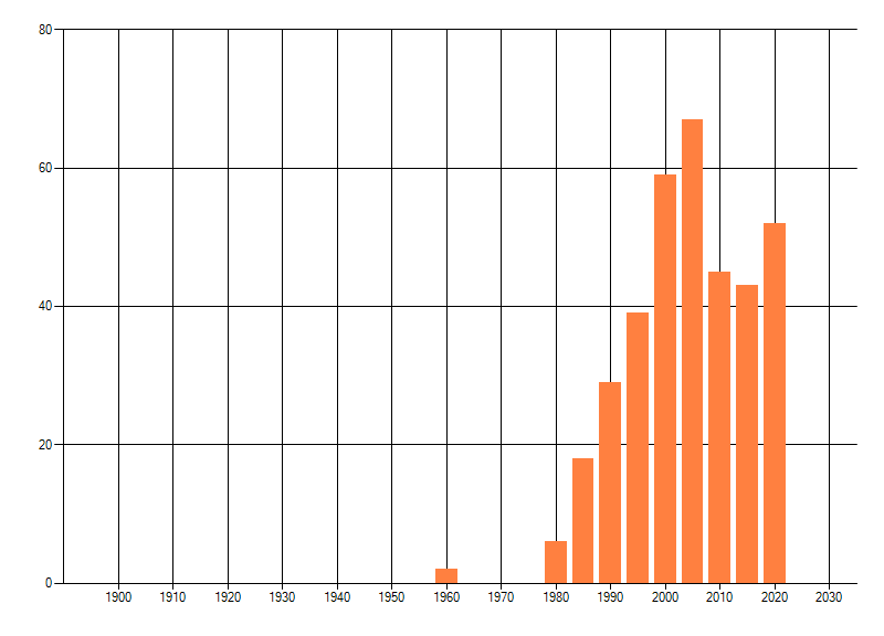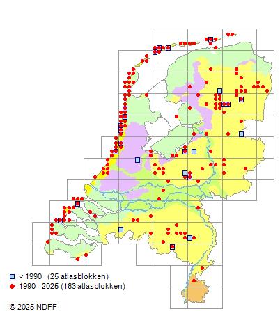 Het aantal atlasblokken (5x5 km) waarin de soort is gemeld binnen een periode van vijf jaar (vanaf 1980) of twintig jaar. Niet gecorrigeerd voor waarnemersinspanning en het aantal doorgegeven waarnemingen kan sterk variëren per periode, dus een trend in verspreiding kan hier niet direct uit worden afgelezen. Het opgegeven jaartal is het eerste jaar van de periode. Bron: gevalideerde waarnemingen uit de NDFF.