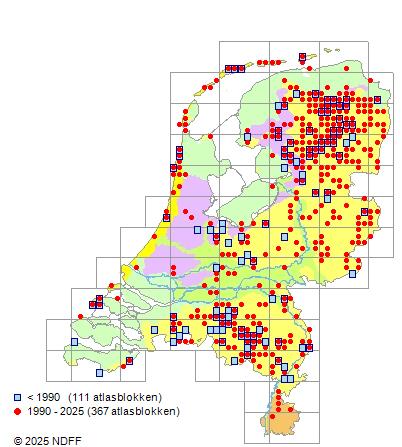 Het aantal atlasblokken (5x5 km) waarin de soort is gemeld binnen een periode van vijf jaar (vanaf 1980) of twintig jaar. Niet gecorrigeerd voor waarnemersinspanning en het aantal doorgegeven waarnemingen kan sterk variëren per periode, dus een trend in verspreiding kan hier niet direct uit worden afgelezen. Het opgegeven jaartal is het eerste jaar van de periode. Bron: gevalideerde waarnemingen uit de NDFF.