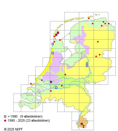 Het aantal atlasblokken (5x5 km) waarin de soort is gemeld binnen een periode van vijf jaar (vanaf 1980) of twintig jaar. Niet gecorrigeerd voor waarnemersinspanning en het aantal doorgegeven waarnemingen kan sterk variëren per periode, dus een trend in verspreiding kan hier niet direct uit worden afgelezen. Het opgegeven jaartal is het eerste jaar van de periode. Bron: gevalideerde waarnemingen uit de NDFF.