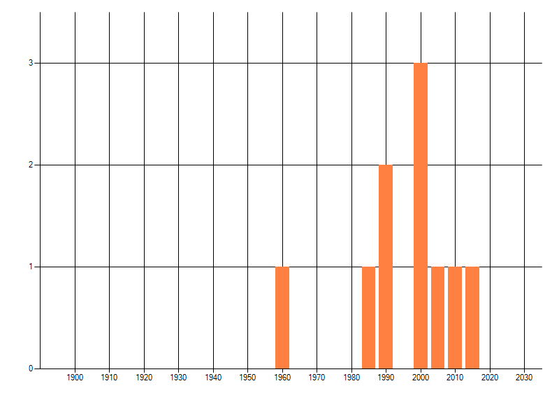 Het aantal atlasblokken (5x5 km) waarin de soort is gemeld binnen een periode van vijf jaar (vanaf 1980) of twintig jaar. Niet gecorrigeerd voor waarnemersinspanning en het aantal doorgegeven waarnemingen kan sterk variëren per periode, dus een trend in verspreiding kan hier niet direct uit worden afgelezen. Het opgegeven jaartal is het eerste jaar van de periode. Bron: gevalideerde waarnemingen uit de NDFF.
