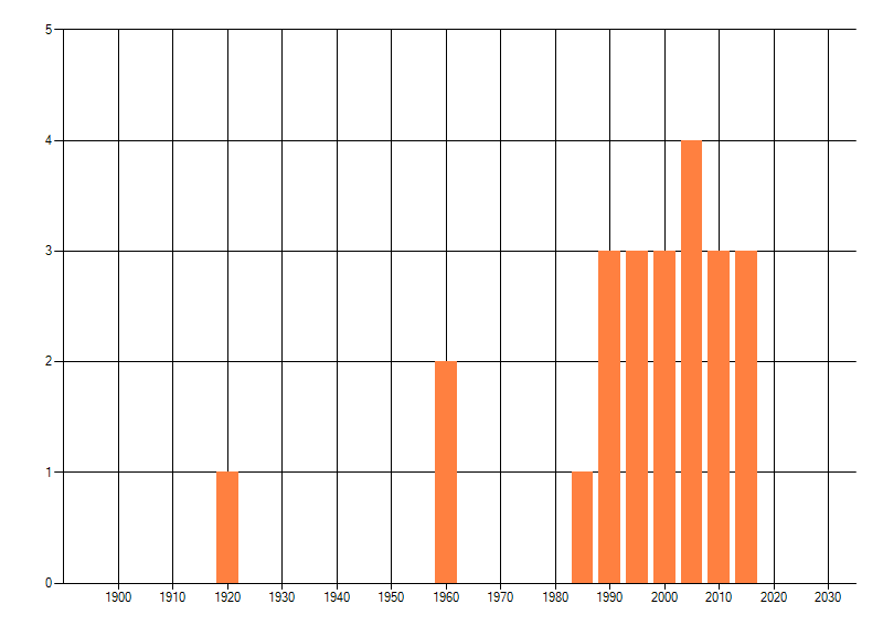 Het aantal atlasblokken (5x5 km) waarin de soort is gemeld binnen een periode van vijf jaar (vanaf 1980) of twintig jaar. Niet gecorrigeerd voor waarnemersinspanning en het aantal doorgegeven waarnemingen kan sterk variëren per periode, dus een trend in verspreiding kan hier niet direct uit worden afgelezen. Het opgegeven jaartal is het eerste jaar van de periode. Bron: gevalideerde waarnemingen uit de NDFF.