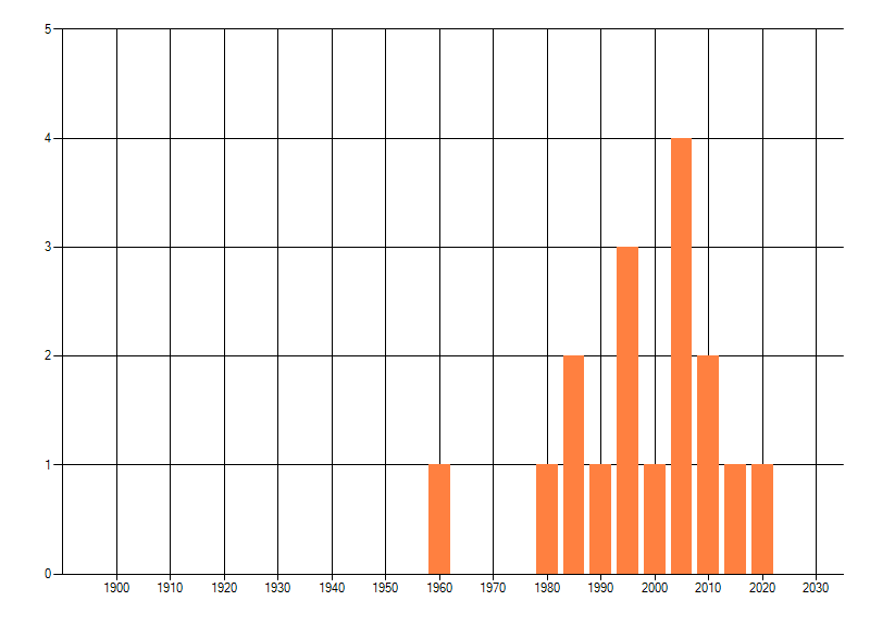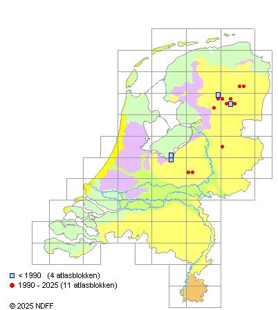 Het aantal atlasblokken (5x5 km) waarin de soort is gemeld binnen een periode van vijf jaar (vanaf 1980) of twintig jaar. Niet gecorrigeerd voor waarnemersinspanning en het aantal doorgegeven waarnemingen kan sterk variëren per periode, dus een trend in verspreiding kan hier niet direct uit worden afgelezen. Het opgegeven jaartal is het eerste jaar van de periode. Bron: gevalideerde waarnemingen uit de NDFF.