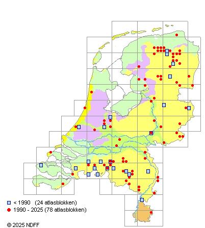 Het aantal atlasblokken (5x5 km) waarin de soort is gemeld binnen een periode van vijf jaar (vanaf 1980) of twintig jaar. Niet gecorrigeerd voor waarnemersinspanning en het aantal doorgegeven waarnemingen kan sterk variëren per periode, dus een trend in verspreiding kan hier niet direct uit worden afgelezen. Het opgegeven jaartal is het eerste jaar van de periode. Bron: gevalideerde waarnemingen uit de NDFF.