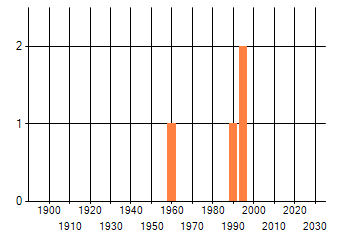 Het aantal atlasblokken (5x5 km) waarin de soort is gemeld binnen een periode van vijf jaar (vanaf 1980) of twintig jaar. Niet gecorrigeerd voor waarnemersinspanning en het aantal doorgegeven waarnemingen kan sterk variëren per periode, dus een trend in verspreiding kan hier niet direct uit worden afgelezen. Het opgegeven jaartal is het eerste jaar van de periode. Bron: gevalideerde waarnemingen uit de NDFF.