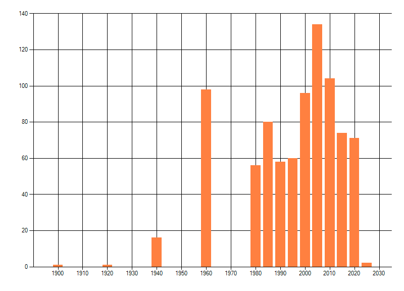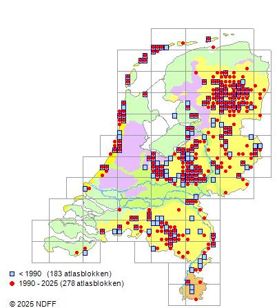 Het aantal atlasblokken (5x5 km) waarin de soort is gemeld binnen een periode van vijf jaar (vanaf 1980) of twintig jaar. Niet gecorrigeerd voor waarnemersinspanning en het aantal doorgegeven waarnemingen kan sterk variëren per periode, dus een trend in verspreiding kan hier niet direct uit worden afgelezen. Het opgegeven jaartal is het eerste jaar van de periode. Bron: gevalideerde waarnemingen uit de NDFF.