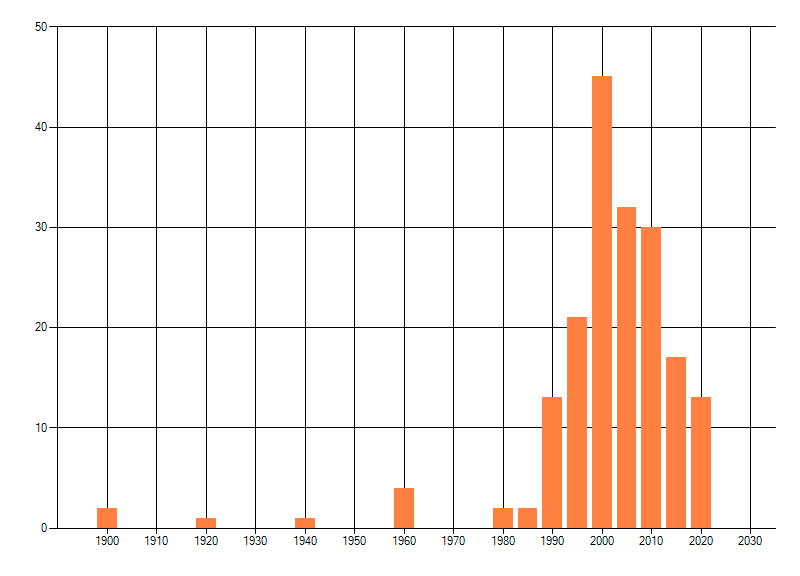 Het aantal atlasblokken (5x5 km) waarin de soort is gemeld binnen een periode van vijf jaar (vanaf 1980) of twintig jaar. Niet gecorrigeerd voor waarnemersinspanning en het aantal doorgegeven waarnemingen kan sterk variëren per periode, dus een trend in verspreiding kan hier niet direct uit worden afgelezen. Het opgegeven jaartal is het eerste jaar van de periode. Bron: gevalideerde waarnemingen uit de NDFF.