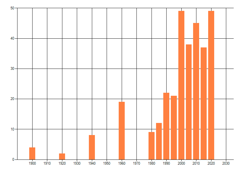 Het aantal atlasblokken (5x5 km) waarin de soort is gemeld binnen een periode van vijf jaar (vanaf 1980) of twintig jaar. Niet gecorrigeerd voor waarnemersinspanning en het aantal doorgegeven waarnemingen kan sterk variëren per periode, dus een trend in verspreiding kan hier niet direct uit worden afgelezen. Het opgegeven jaartal is het eerste jaar van de periode. Bron: gevalideerde waarnemingen uit de NDFF.