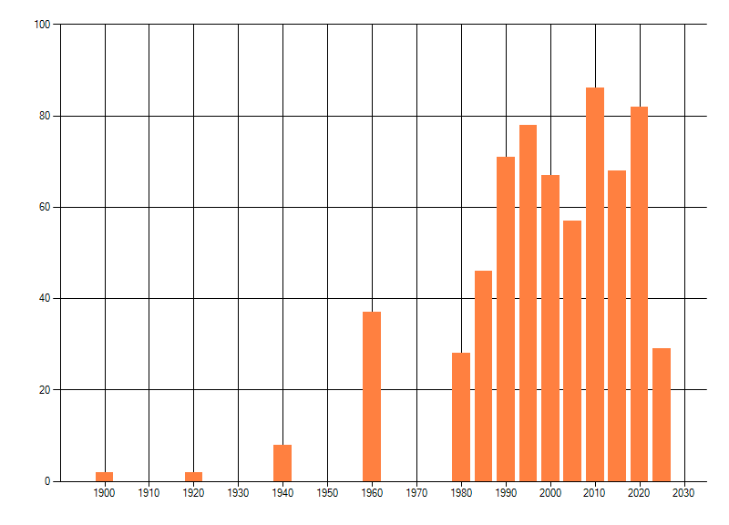 Het aantal atlasblokken (5x5 km) waarin de soort is gemeld binnen een periode van vijf jaar (vanaf 1980) of twintig jaar. Niet gecorrigeerd voor waarnemersinspanning en het aantal doorgegeven waarnemingen kan sterk variëren per periode, dus een trend in verspreiding kan hier niet direct uit worden afgelezen. Het opgegeven jaartal is het eerste jaar van de periode. Bron: gevalideerde waarnemingen uit de NDFF.