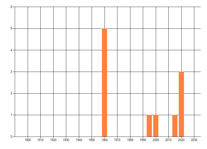 Het aantal atlasblokken (5x5 km) waarin de soort is gemeld binnen een periode van vijf jaar (vanaf 1980) of twintig jaar. Niet gecorrigeerd voor waarnemersinspanning en het aantal doorgegeven waarnemingen kan sterk variëren per periode, dus een trend in verspreiding kan hier niet direct uit worden afgelezen. Het opgegeven jaartal is het eerste jaar van de periode. Bron: gevalideerde waarnemingen uit de NDFF.
