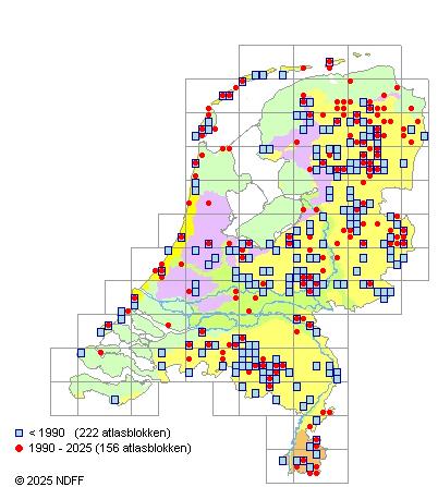 Het aantal atlasblokken (5x5 km) waarin de soort is gemeld binnen een periode van vijf jaar (vanaf 1980) of twintig jaar. Niet gecorrigeerd voor waarnemersinspanning en het aantal doorgegeven waarnemingen kan sterk variëren per periode, dus een trend in verspreiding kan hier niet direct uit worden afgelezen. Het opgegeven jaartal is het eerste jaar van de periode. Bron: gevalideerde waarnemingen uit de NDFF.