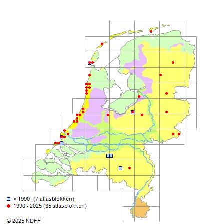 Het aantal atlasblokken (5x5 km) waarin de soort is gemeld binnen een periode van vijf jaar (vanaf 1980) of twintig jaar. Niet gecorrigeerd voor waarnemersinspanning en het aantal doorgegeven waarnemingen kan sterk variëren per periode, dus een trend in verspreiding kan hier niet direct uit worden afgelezen. Het opgegeven jaartal is het eerste jaar van de periode. Bron: gevalideerde waarnemingen uit de NDFF.