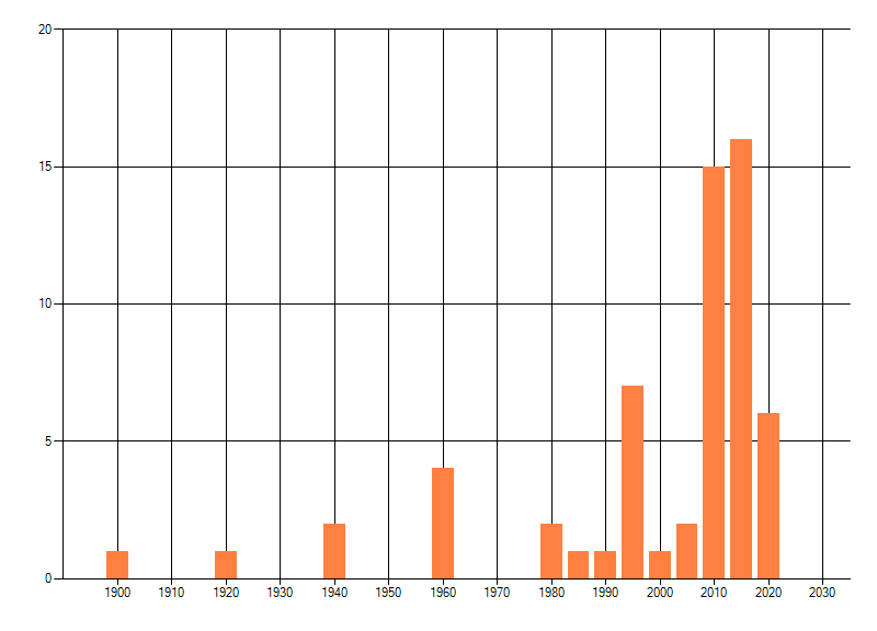 Het aantal atlasblokken (5x5 km) waarin de soort is gemeld binnen een periode van vijf jaar (vanaf 1980) of twintig jaar. Niet gecorrigeerd voor waarnemersinspanning en het aantal doorgegeven waarnemingen kan sterk variëren per periode, dus een trend in verspreiding kan hier niet direct uit worden afgelezen. Het opgegeven jaartal is het eerste jaar van de periode. Bron: gevalideerde waarnemingen uit de NDFF.