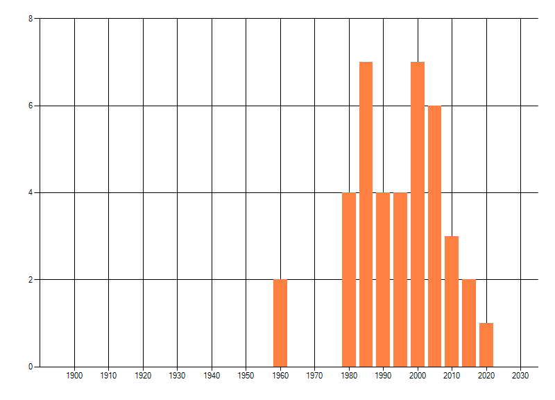 Het aantal atlasblokken (5x5 km) waarin de soort is gemeld binnen een periode van vijf jaar (vanaf 1980) of twintig jaar. Niet gecorrigeerd voor waarnemersinspanning en het aantal doorgegeven waarnemingen kan sterk variëren per periode, dus een trend in verspreiding kan hier niet direct uit worden afgelezen. Het opgegeven jaartal is het eerste jaar van de periode. Bron: gevalideerde waarnemingen uit de NDFF.