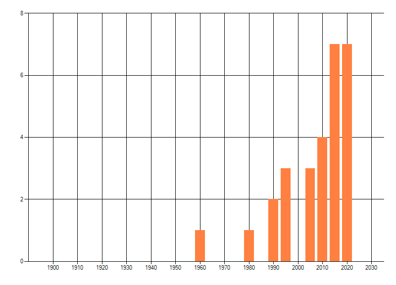 Het aantal atlasblokken (5x5 km) waarin de soort is gemeld binnen een periode van vijf jaar (vanaf 1980) of twintig jaar. Niet gecorrigeerd voor waarnemersinspanning en het aantal doorgegeven waarnemingen kan sterk variëren per periode, dus een trend in verspreiding kan hier niet direct uit worden afgelezen. Het opgegeven jaartal is het eerste jaar van de periode. Bron: gevalideerde waarnemingen uit de NDFF.