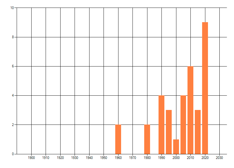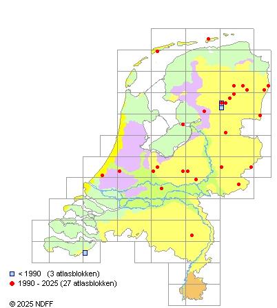 Het aantal atlasblokken (5x5 km) waarin de soort is gemeld binnen een periode van vijf jaar (vanaf 1980) of twintig jaar. Niet gecorrigeerd voor waarnemersinspanning en het aantal doorgegeven waarnemingen kan sterk variëren per periode, dus een trend in verspreiding kan hier niet direct uit worden afgelezen. Het opgegeven jaartal is het eerste jaar van de periode. Bron: gevalideerde waarnemingen uit de NDFF.