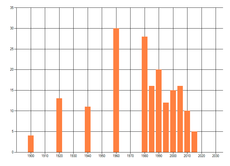 Het aantal atlasblokken (5x5 km) waarin de soort is gemeld binnen een periode van vijf jaar (vanaf 1980) of twintig jaar. Niet gecorrigeerd voor waarnemersinspanning en het aantal doorgegeven waarnemingen kan sterk variëren per periode, dus een trend in verspreiding kan hier niet direct uit worden afgelezen. Het opgegeven jaartal is het eerste jaar van de periode. Bron: gevalideerde waarnemingen uit de NDFF.