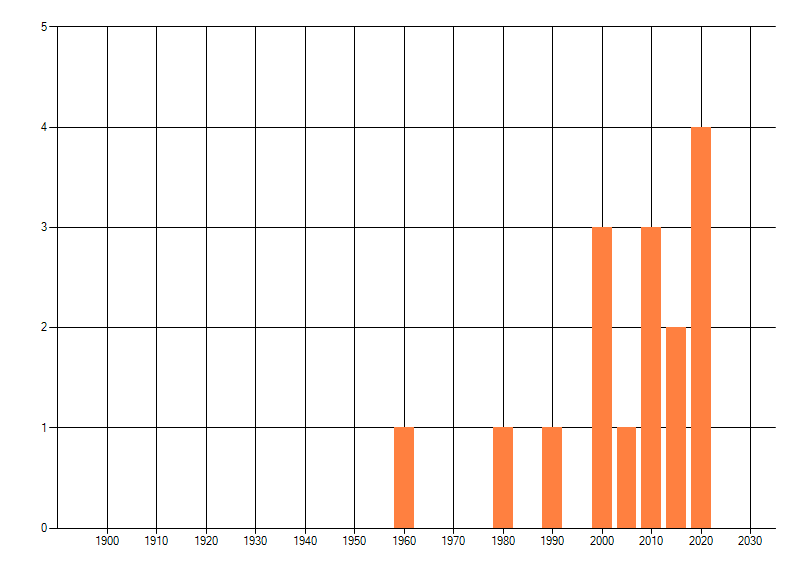 Het aantal atlasblokken (5x5 km) waarin de soort is gemeld binnen een periode van vijf jaar (vanaf 1980) of twintig jaar. Niet gecorrigeerd voor waarnemersinspanning en het aantal doorgegeven waarnemingen kan sterk variëren per periode, dus een trend in verspreiding kan hier niet direct uit worden afgelezen. Het opgegeven jaartal is het eerste jaar van de periode. Bron: gevalideerde waarnemingen uit de NDFF.