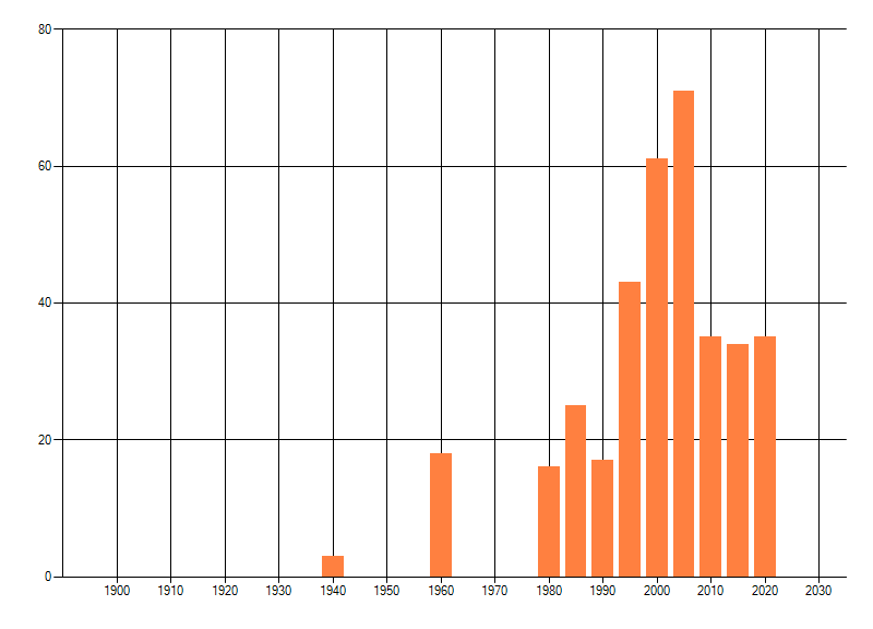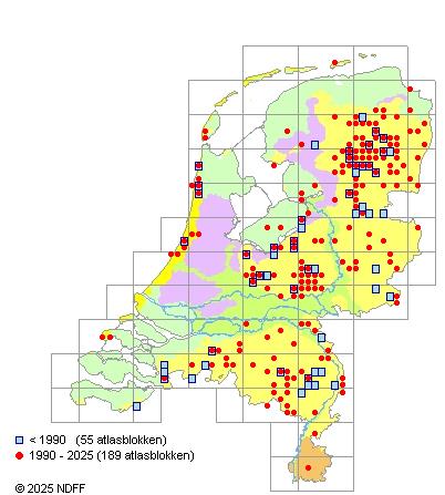 Het aantal atlasblokken (5x5 km) waarin de soort is gemeld binnen een periode van vijf jaar (vanaf 1980) of twintig jaar. Niet gecorrigeerd voor waarnemersinspanning en het aantal doorgegeven waarnemingen kan sterk variëren per periode, dus een trend in verspreiding kan hier niet direct uit worden afgelezen. Het opgegeven jaartal is het eerste jaar van de periode. Bron: gevalideerde waarnemingen uit de NDFF.