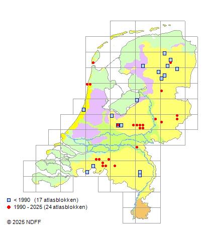 Het aantal atlasblokken (5x5 km) waarin de soort is gemeld binnen een periode van vijf jaar (vanaf 1980) of twintig jaar. Niet gecorrigeerd voor waarnemersinspanning en het aantal doorgegeven waarnemingen kan sterk variëren per periode, dus een trend in verspreiding kan hier niet direct uit worden afgelezen. Het opgegeven jaartal is het eerste jaar van de periode. Bron: gevalideerde waarnemingen uit de NDFF.