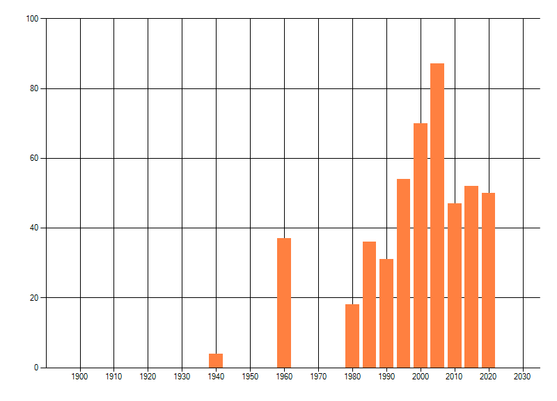 Het aantal atlasblokken (5x5 km) waarin de soort is gemeld binnen een periode van vijf jaar (vanaf 1980) of twintig jaar. Niet gecorrigeerd voor waarnemersinspanning en het aantal doorgegeven waarnemingen kan sterk variëren per periode, dus een trend in verspreiding kan hier niet direct uit worden afgelezen. Het opgegeven jaartal is het eerste jaar van de periode. Bron: gevalideerde waarnemingen uit de NDFF.