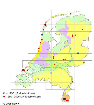 Het aantal atlasblokken (5x5 km) waarin de soort is gemeld binnen een periode van vijf jaar (vanaf 1980) of twintig jaar. Niet gecorrigeerd voor waarnemersinspanning en het aantal doorgegeven waarnemingen kan sterk variëren per periode, dus een trend in verspreiding kan hier niet direct uit worden afgelezen. Het opgegeven jaartal is het eerste jaar van de periode. Bron: gevalideerde waarnemingen uit de NDFF.