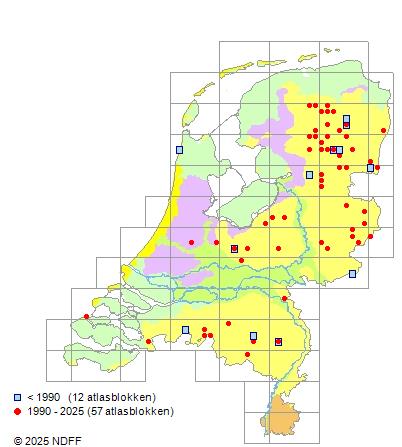 Het aantal atlasblokken (5x5 km) waarin de soort is gemeld binnen een periode van vijf jaar (vanaf 1980) of twintig jaar. Niet gecorrigeerd voor waarnemersinspanning en het aantal doorgegeven waarnemingen kan sterk variëren per periode, dus een trend in verspreiding kan hier niet direct uit worden afgelezen. Het opgegeven jaartal is het eerste jaar van de periode. Bron: gevalideerde waarnemingen uit de NDFF.