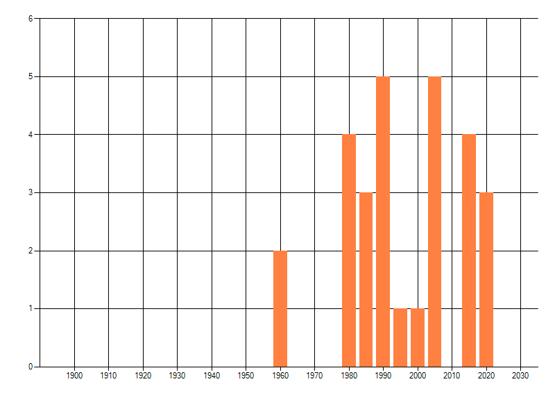 Het aantal atlasblokken (5x5 km) waarin de soort is gemeld binnen een periode van vijf jaar (vanaf 1980) of twintig jaar. Niet gecorrigeerd voor waarnemersinspanning en het aantal doorgegeven waarnemingen kan sterk variëren per periode, dus een trend in verspreiding kan hier niet direct uit worden afgelezen. Het opgegeven jaartal is het eerste jaar van de periode. Bron: gevalideerde waarnemingen uit de NDFF.