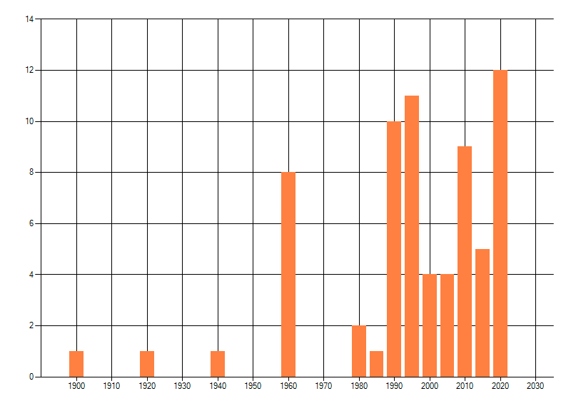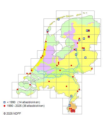Het aantal atlasblokken (5x5 km) waarin de soort is gemeld binnen een periode van vijf jaar (vanaf 1980) of twintig jaar. Niet gecorrigeerd voor waarnemersinspanning en het aantal doorgegeven waarnemingen kan sterk variëren per periode, dus een trend in verspreiding kan hier niet direct uit worden afgelezen. Het opgegeven jaartal is het eerste jaar van de periode. Bron: gevalideerde waarnemingen uit de NDFF.