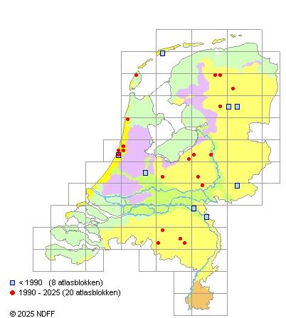 Het aantal atlasblokken (5x5 km) waarin de soort is gemeld binnen een periode van vijf jaar (vanaf 1980) of twintig jaar. Niet gecorrigeerd voor waarnemersinspanning en het aantal doorgegeven waarnemingen kan sterk variëren per periode, dus een trend in verspreiding kan hier niet direct uit worden afgelezen. Het opgegeven jaartal is het eerste jaar van de periode. Bron: gevalideerde waarnemingen uit de NDFF.
