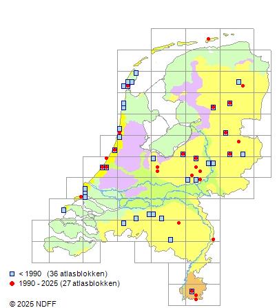 Het aantal atlasblokken (5x5 km) waarin de soort is gemeld binnen een periode van vijf jaar (vanaf 1980) of twintig jaar. Niet gecorrigeerd voor waarnemersinspanning en het aantal doorgegeven waarnemingen kan sterk variëren per periode, dus een trend in verspreiding kan hier niet direct uit worden afgelezen. Het opgegeven jaartal is het eerste jaar van de periode. Bron: gevalideerde waarnemingen uit de NDFF.