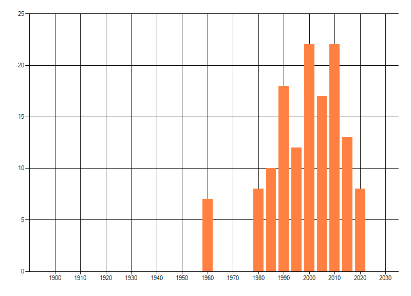 Het aantal atlasblokken (5x5 km) waarin de soort is gemeld binnen een periode van vijf jaar (vanaf 1980) of twintig jaar. Niet gecorrigeerd voor waarnemersinspanning en het aantal doorgegeven waarnemingen kan sterk variëren per periode, dus een trend in verspreiding kan hier niet direct uit worden afgelezen. Het opgegeven jaartal is het eerste jaar van de periode. Bron: gevalideerde waarnemingen uit de NDFF.