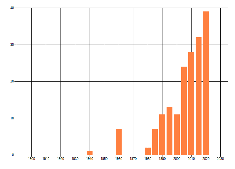 Het aantal atlasblokken (5x5 km) waarin de soort is gemeld binnen een periode van vijf jaar (vanaf 1980) of twintig jaar. Niet gecorrigeerd voor waarnemersinspanning en het aantal doorgegeven waarnemingen kan sterk variëren per periode, dus een trend in verspreiding kan hier niet direct uit worden afgelezen. Het opgegeven jaartal is het eerste jaar van de periode. Bron: gevalideerde waarnemingen uit de NDFF.